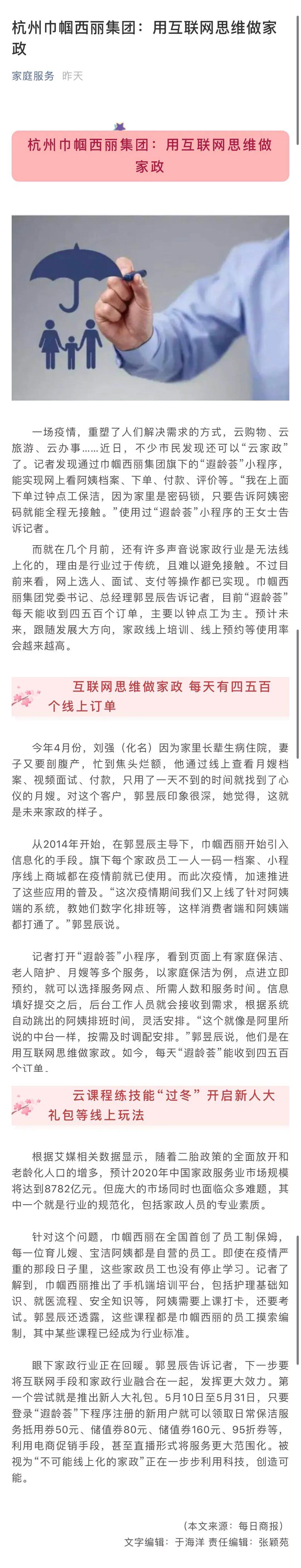 巾幗西麗集團(tuán)旗下遐齡薈商城受“家庭服務(wù)”宣傳報導(dǎo)