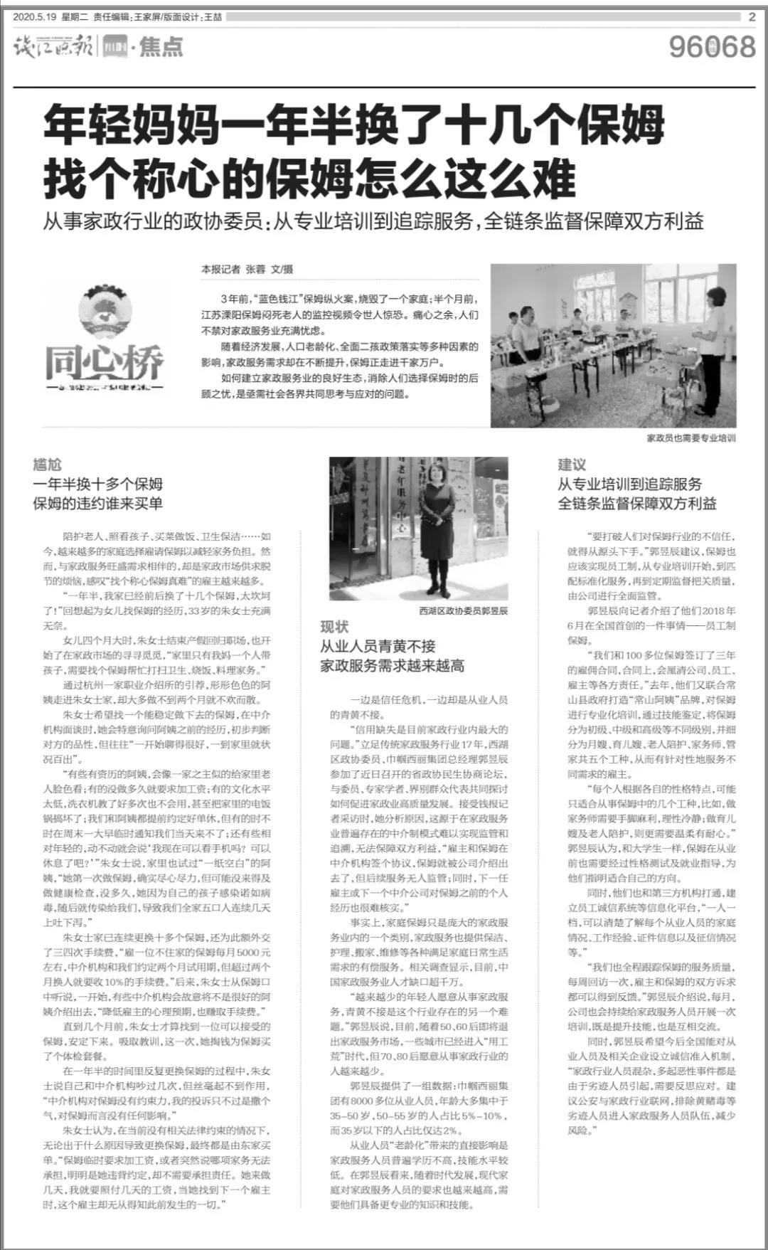 “信用缺失是目前家政行業(yè)內(nèi)最大的問題。”立足傳統(tǒng)家政服務(wù)行業(yè)17年,浙江省杭州市西湖區(qū)政協(xié)委員、巾幗西麗集團總經(jīng)理郭昱辰參加了近日召開的浙江省政協(xié)民生協(xié)商論壇,與委員、專家學(xué)者、界別群眾代表共同探討如何促進家政業(yè)高質(zhì)量發(fā)展。接受錢報記者采訪時,她分析原因,這源于在家政服務(wù)業(yè)普遍存在的中介制模式難以實現(xiàn)監(jiān)管和追溯,無法保障雙方利益,“雇主和保姆在中介機構(gòu)簽個協(xié)議,保姆就被公司介紹出去了,但后續(xù)服務(wù)無人監(jiān)管;同時,下一任雇主或下一個中介公司對保姆之前的個人經(jīng)歷也很難核實。”2020年5月19號巾幗西麗集團旗下遐齡薈商城受“錢江晚報”2、3、16版宣傳報道。