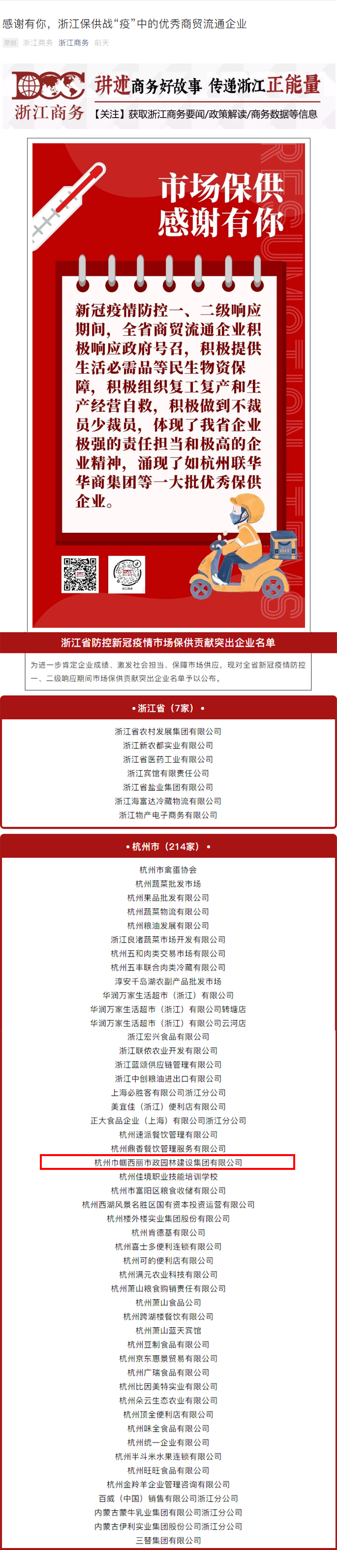 2020年05月25日,浙江商務(wù)發(fā)布了對全省新冠疫情防控一、二級響應(yīng)期間市場保供貢獻(xiàn)突出企業(yè)名單,巾幗西麗市政園林集團(tuán)位列其中。