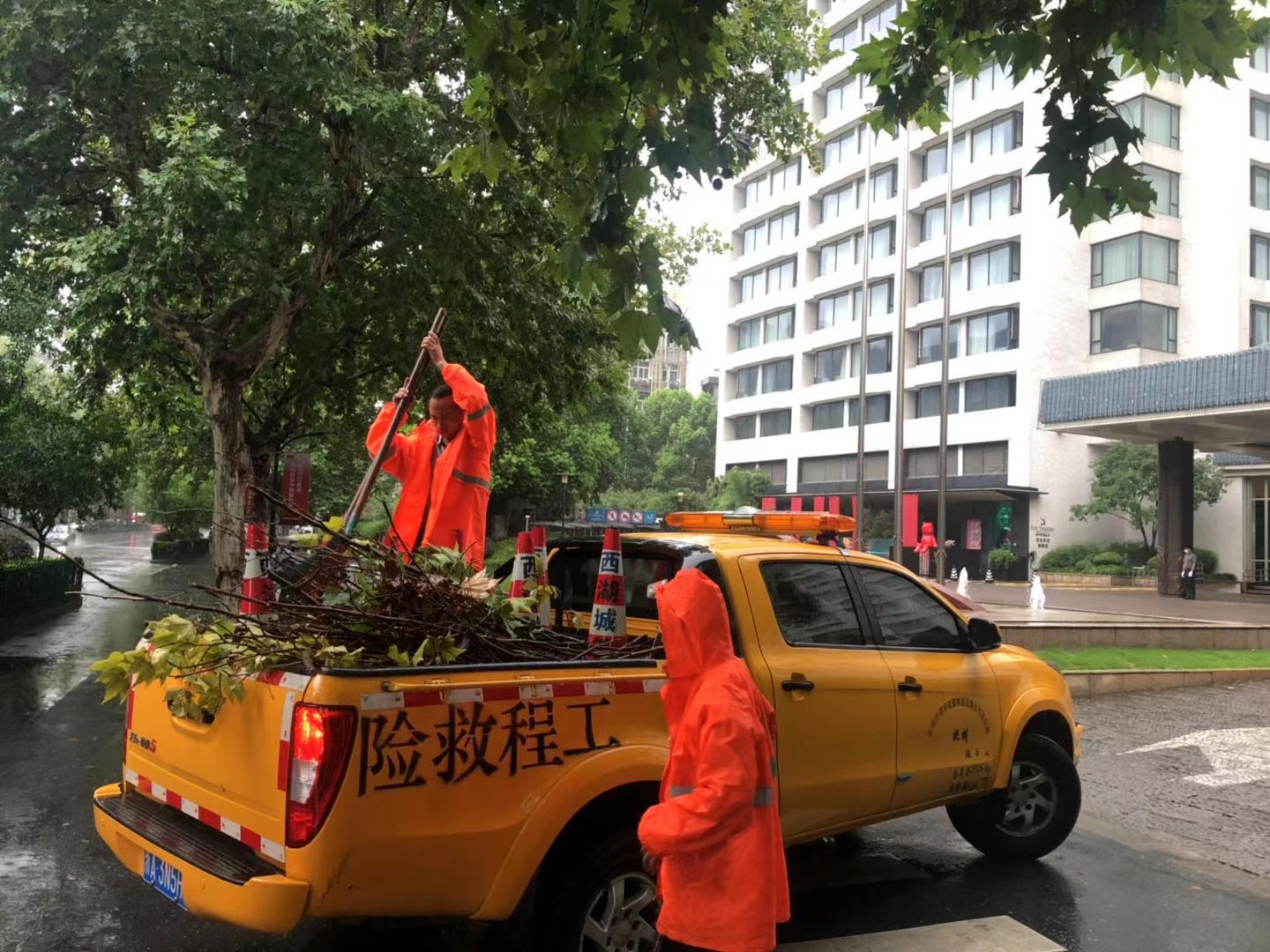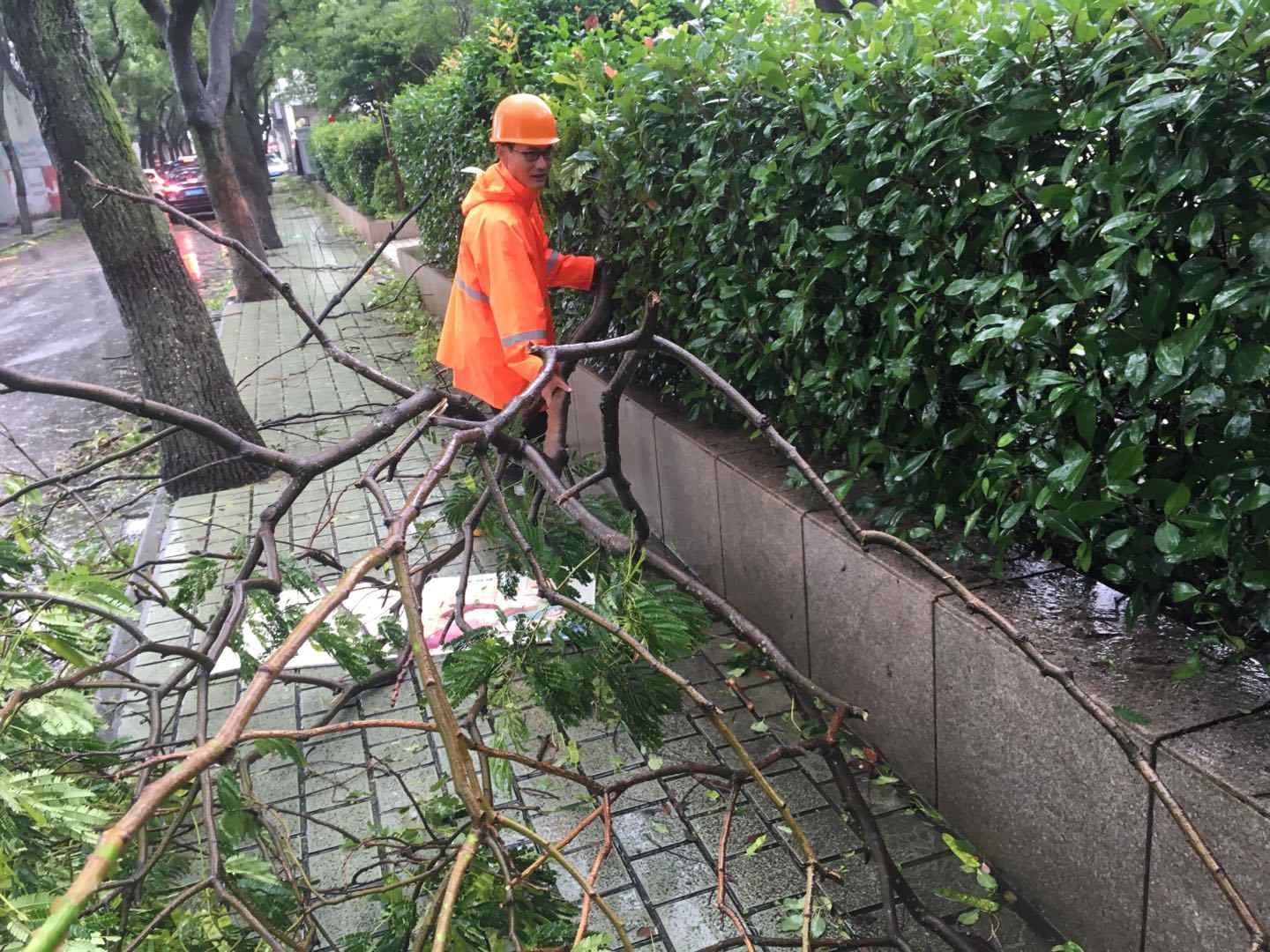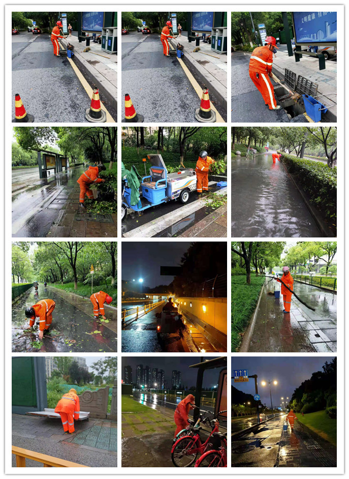上城服務部為落實此次抗臺防汛任務,在臺風來臨前,對邊轄區(qū)內(nèi)的窨井進行了排查清掏,加強了道路積泥積塵的清洗,清除枯枝落葉、垃圾雜物,提前做好應對準備。在防汛任務中,服務部全體員工堅守崗位,逆風而行,加強路面巡查,排除安全隱患,清除斷枝落葉,在積水點設置警示標志,排除積水。