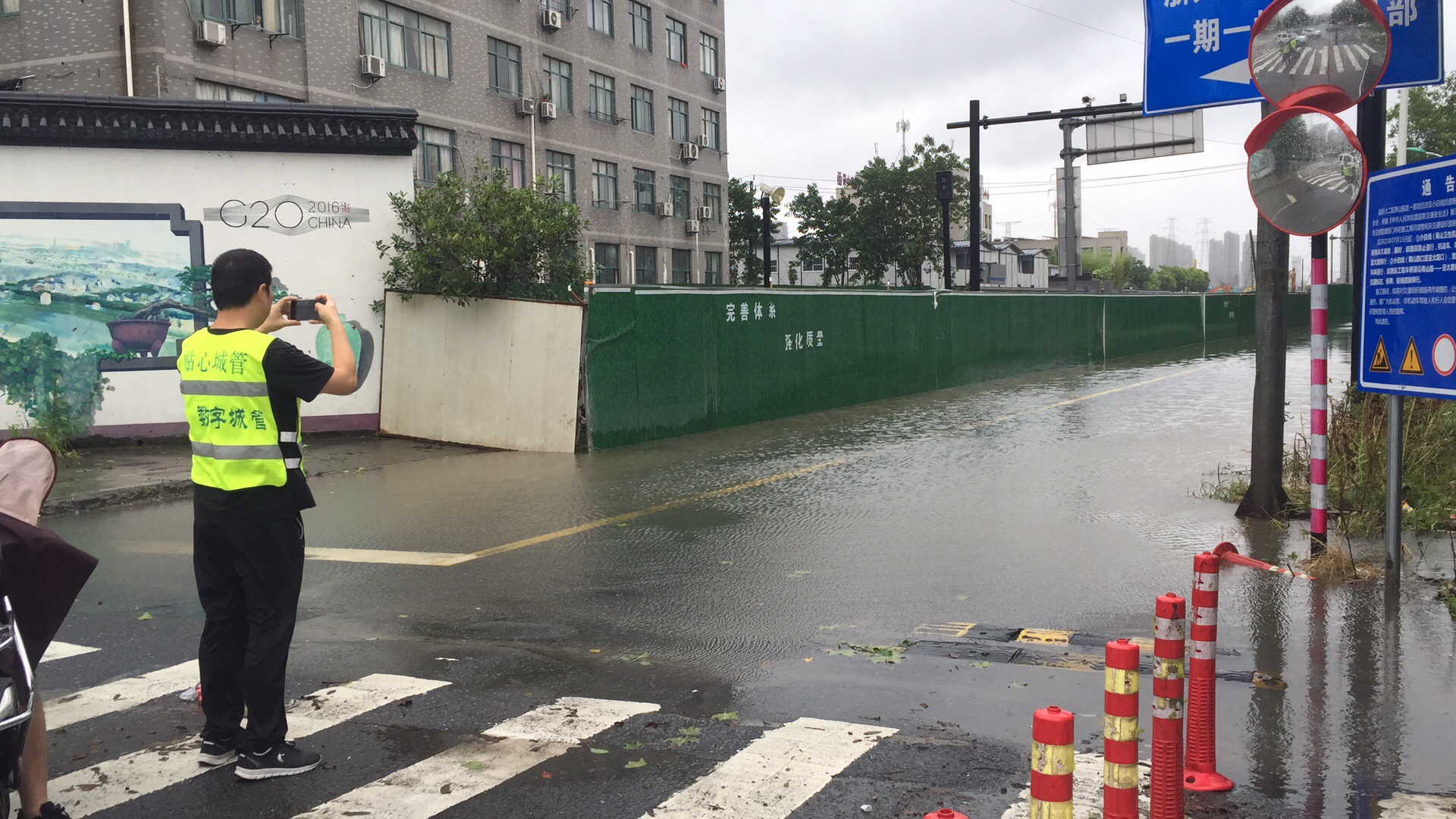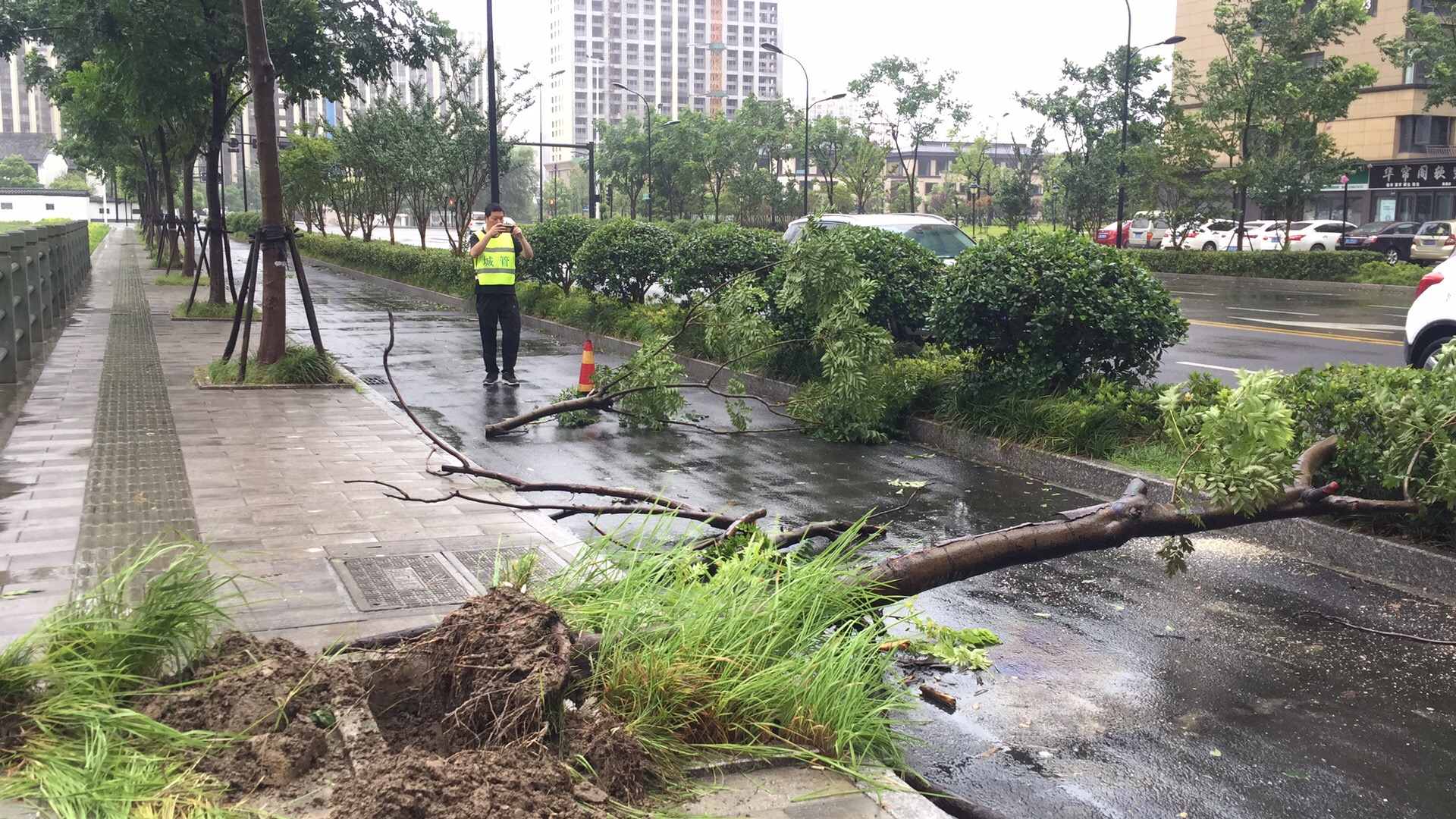 蕭山服務部對城市街道進行巡查,大樹被臺風刮倒,暴雨使路面積水,工作人員及時根據(jù)實際情況做出整改方案,加快城市恢復速度。