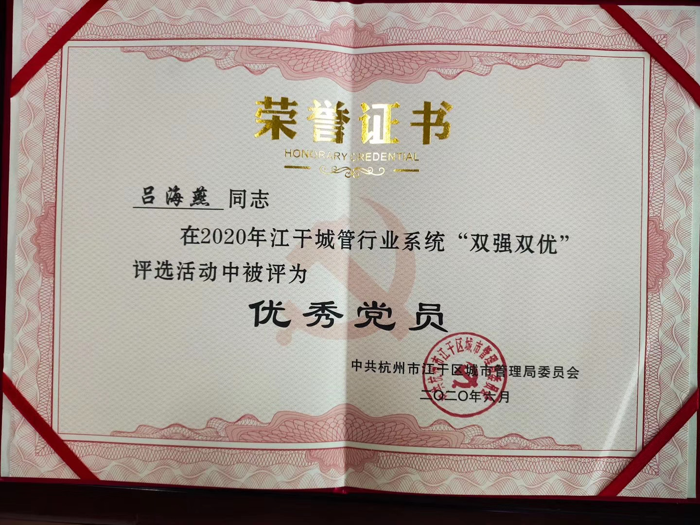 這些年,呂海燕始終以共產(chǎn)黨員的標準來嚴格要求自己,堅持在黨務工作的平凡崗位上勤勤懇懇、兢兢業(yè)業(yè)、扎扎實實的干好每一項工作。一分耕耘,一份收獲。這些年,在公司的培養(yǎng)下,呂海燕個人也得到了快速成長,從一名普通的黨務工作者成長為集團黨委宣傳委員、公司品牌部副經(jīng)理,先后多次榮獲文新街道優(yōu)秀黨務工作者、江干區(qū)城管行業(yè)系統(tǒng)“雙強雙優(yōu)”優(yōu)秀黨員等榮譽稱號。