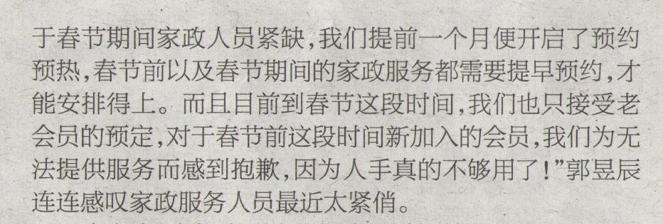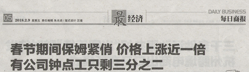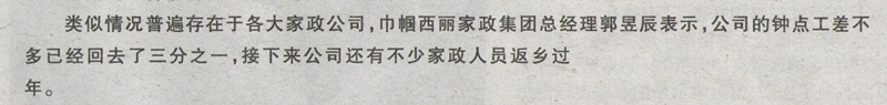 春節(jié)期間家政需求大,“訂單旺”與“用人荒”狹路相逢,廣大市民紛紛反映家政服務(wù)員難預(yù)約。巾幗西麗家政集團(tuán)總經(jīng)理郭昱辰最近也被各大媒體受邀訪談,為“過(guò)年保姆返鄉(xiāng),家政服務(wù)人手不足”這一現(xiàn)象支招。