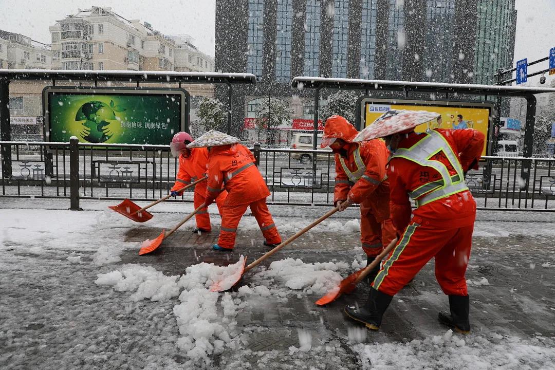 中午過后,大雪逐漸轉(zhuǎn)為了大雨,雨雪交加的復(fù)雜天氣給環(huán)衛(wèi)工人們加大了作業(yè)難度,為防止降溫后的路面結(jié)冰,環(huán)衛(wèi)工人們一刻不敢停歇,緊張有序地進(jìn)行除雪工作。冰冷的雨水掉落在環(huán)衛(wèi)工人的臉上,他們不畏嚴(yán)寒,勇敢向前,不知疲倦地為市民清掃出一條又一條出行之路,讓人不禁感嘆,比雪景更美的是茫茫雪白中的那一抹橘紅。