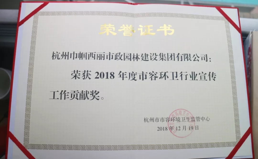 會(huì)議對(duì)2018年市容環(huán)衛(wèi)行業(yè)宣傳先進(jìn)單位進(jìn)行表彰,杭州巾幗西麗市政園林建設(shè)集團(tuán)有限公司榮獲“2018年度市容環(huán)衛(wèi)行業(yè)宣傳工作貢獻(xiàn)獎(jiǎng)”,郭昱辰總經(jīng)理代表公司接受表彰。
