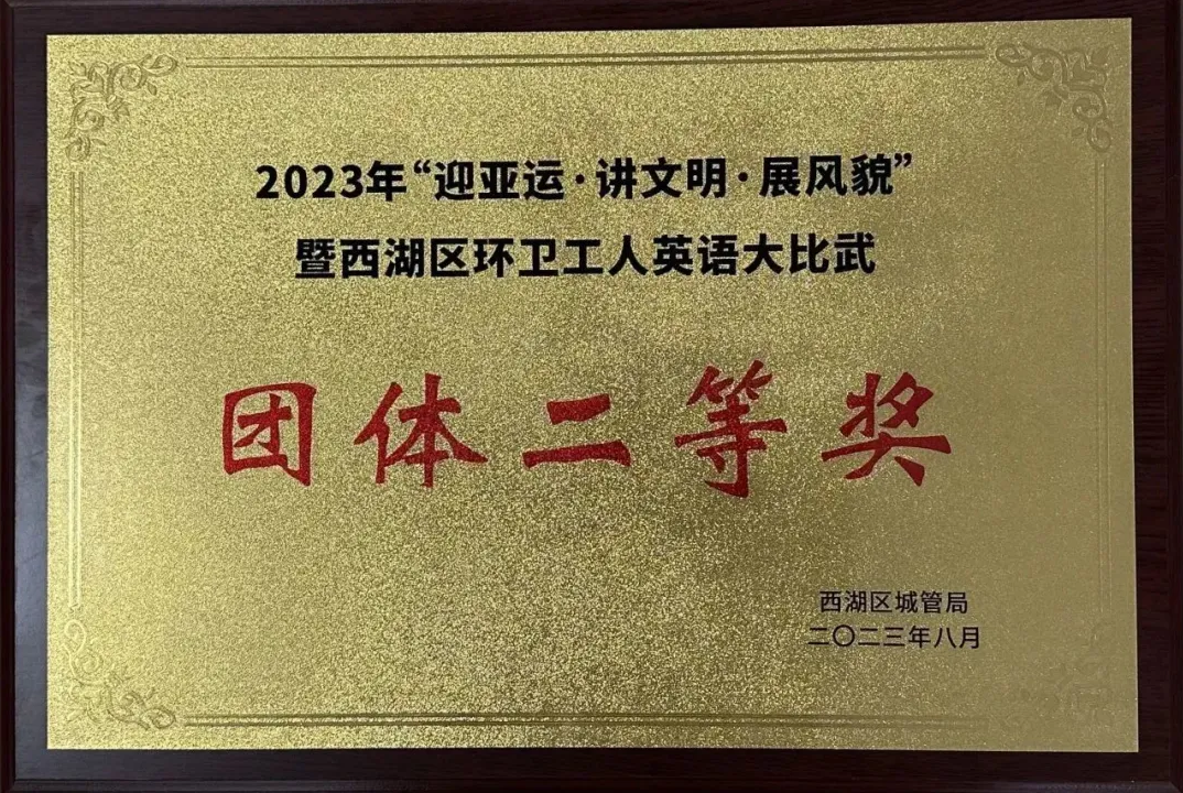 8月24日上午,由杭州市環(huán)衛(wèi)固廢中心指導(dǎo),西湖區(qū)城管局主辦的“迎亞運(yùn)·講文明·展風(fēng)貌暨西湖區(qū)環(huán)衛(wèi)工人英語大比武”活動在杭州城管驛站慧仁家園南區(qū)黨群服務(wù)站舉辦,巾幗西麗集團(tuán)派出2名環(huán)衛(wèi)代表參賽,進(jìn)行精彩比拼,為集團(tuán)贏得了“團(tuán)體二等獎”。