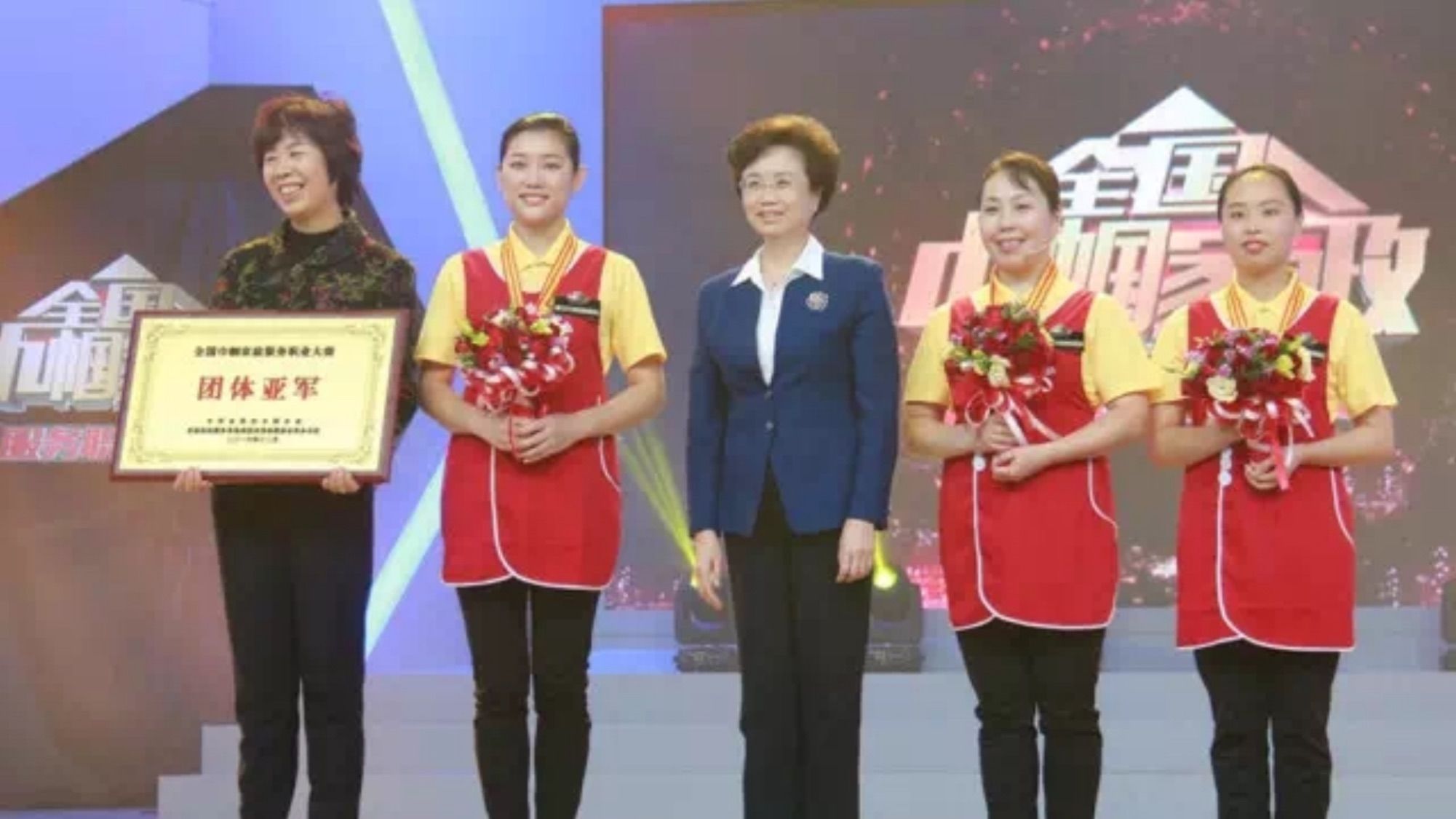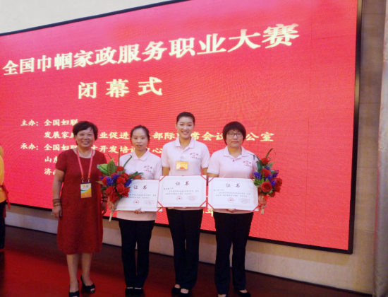▲2016年8月公司黃圓媛等三名員工代表浙江省參加全國(guó)巾幗西麗家政服務(wù)職業(yè)大賽初賽獲得總分第二名,董事長(zhǎng)丁常菊與三名選手合影。